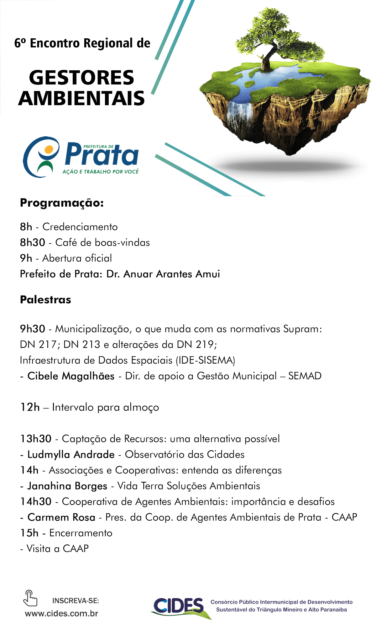 O Consórcio Público Intermunicipal de Desenvolvimento Sustentável do Triângulo Mineiro e Alto Paranaíba – CIDES, juntamente com a Prefeitura Municipal de Prata-MG, por meio da Secretaria Municipal de Meio Ambiente, realiza o 6º Encontro Regional de Gestores Ambientais.