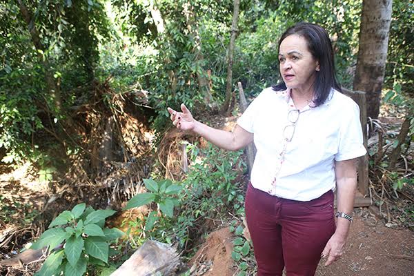 A professora do Instituto de Geografia da UFU Ângela Soares foi ao córrego da Lagoinha e faz análise de todos os cursos d’água (Foto: Celso Ribeiro)