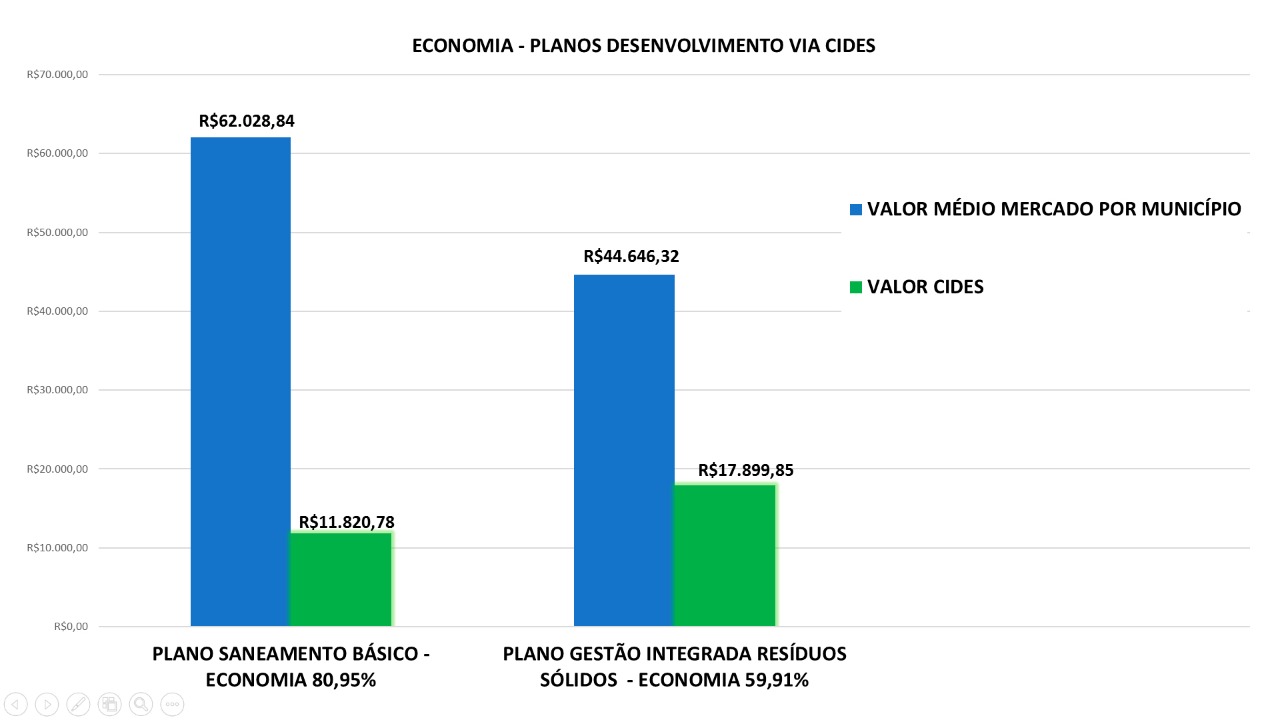Cenários que se constroem por meio da eficiência em projetos que geram economia para os municípios e para o consórcio conforme comparativos de custos de serviços equivalentes aos realizados pelo CIDES. Os comparativos abaixo são exemplos apresentados na assembleia.