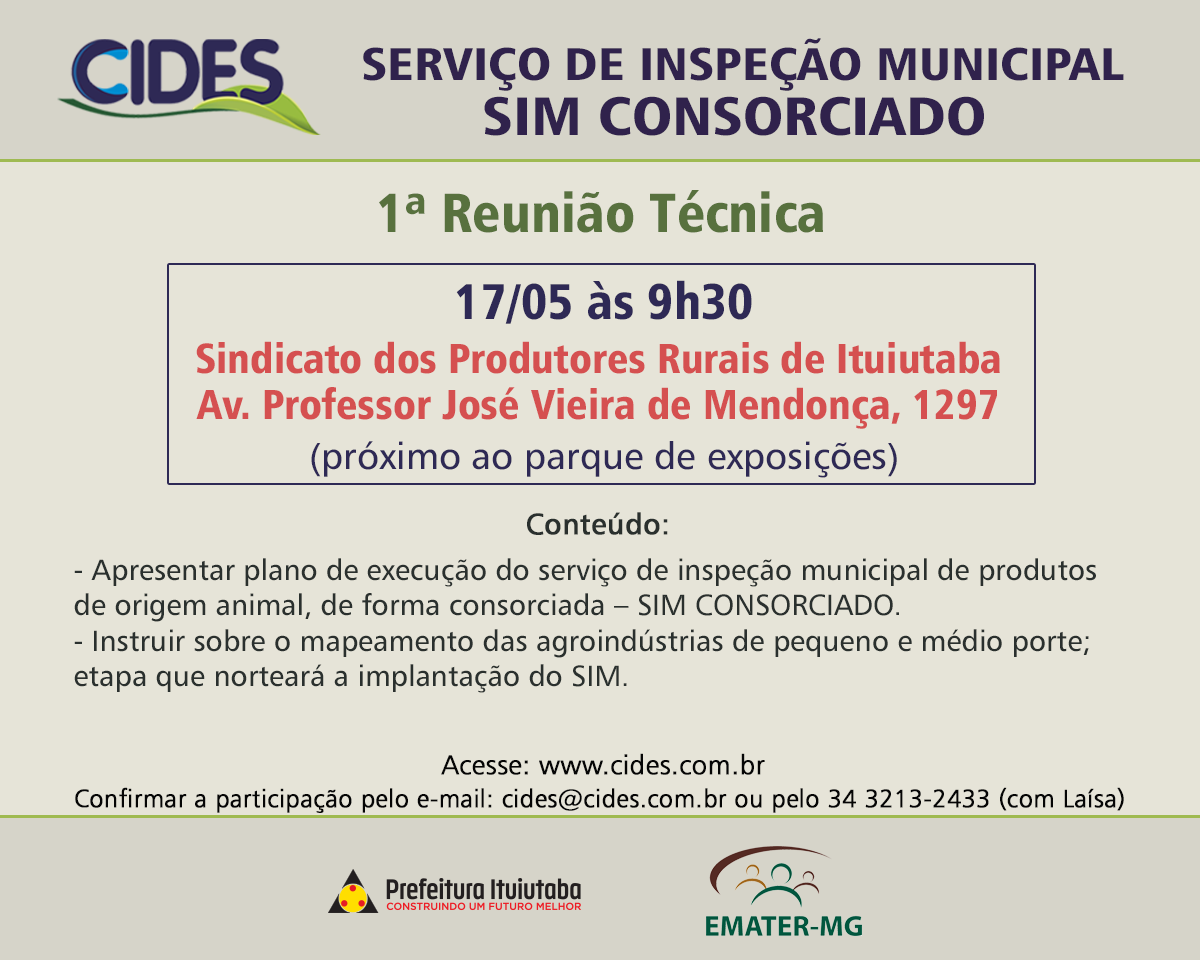A reunião tem como objetivo apresentar aos Prefeitos, Secretários Municipais de Agricultura, Pecuária e Abastecimento, aos Extensionistas da Emater-MG e demais participantes, como será realizado o Serviço de Inspeção Municipal – SIM, para produtos de origem animal, de forma consorciada – SIM CONSORCIADO.