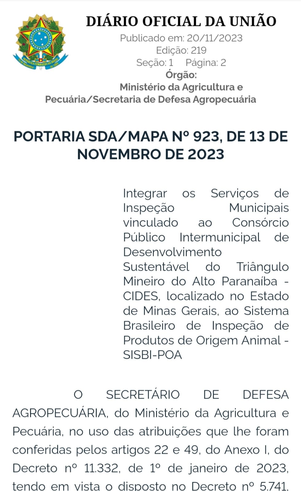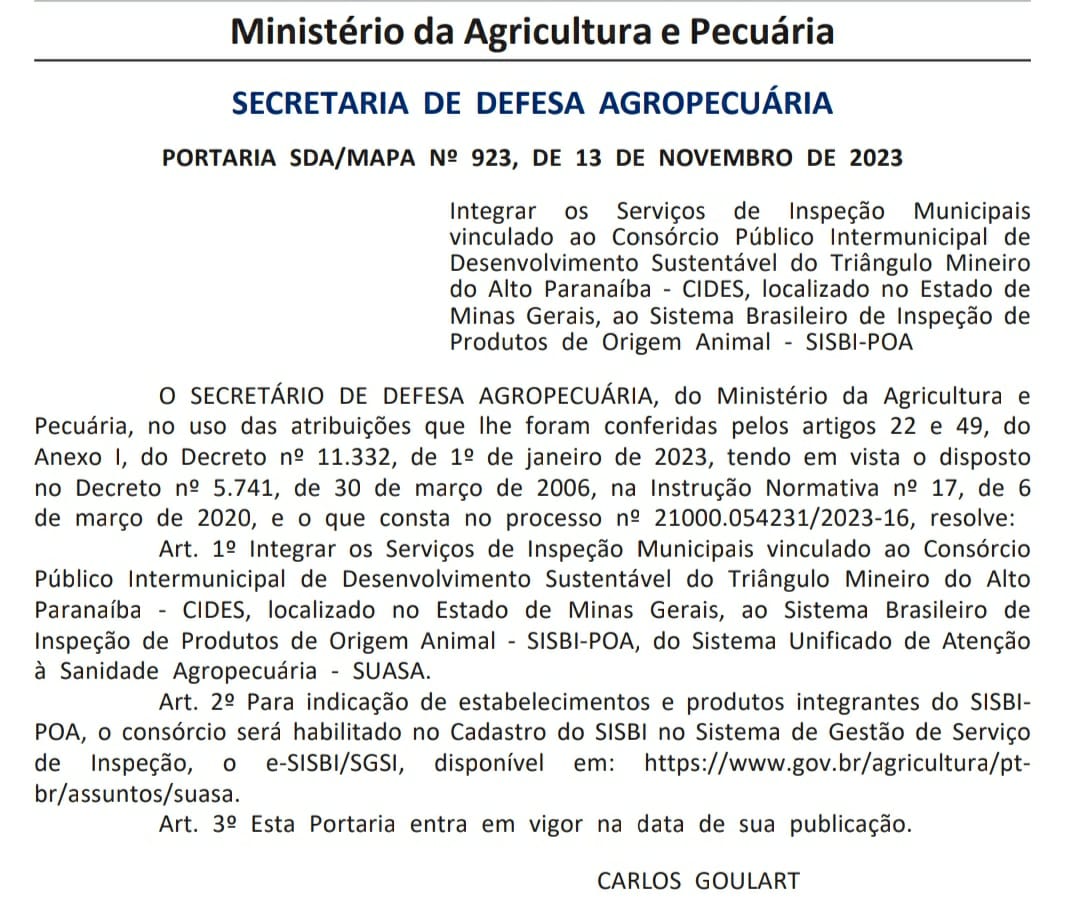 A Portaria nº 923, de 13 de novembro de 2023, da Secretaria de Defesa Agropecuária, que integra os Serviços de Inspeções Municipais vinculados ao Consórcio Público Intermunicipal de Desenvolvimento Sustentável do Triângulo Mineiro e Alto Paranaíba – CIDES, localizado no Estado de Minas Gerais, ao Sistema Brasileiro de Inspeção de Produtos de Origem Animal – SISBI-POA foi publicada no Diário Oficial da União da última sexta-feira (17/11).